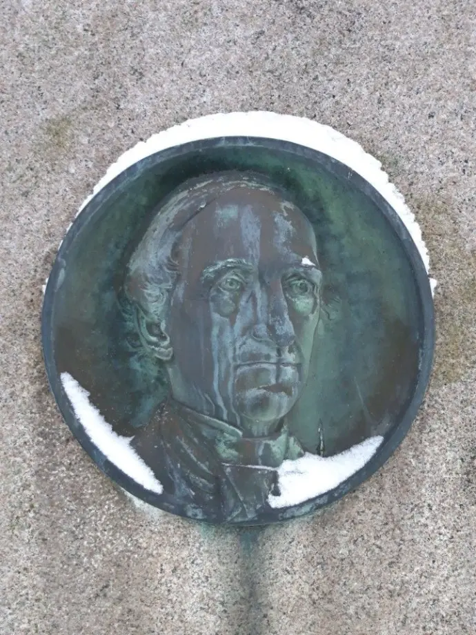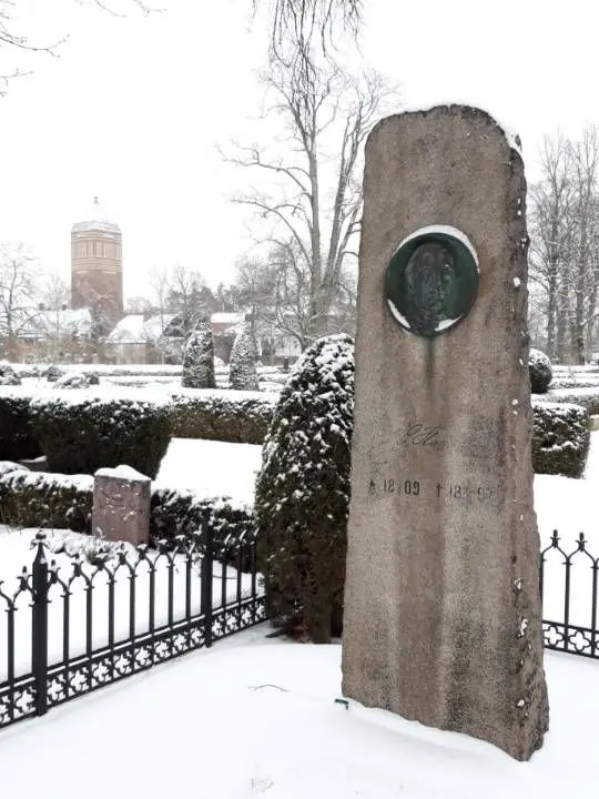 Relieflen gjuten i brons pryder Hagdahls grav på Gamla griftegården i Linköping.