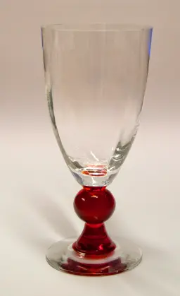 Ett stort glas som passar till vin och öl och ett litet glas för vatten har formgivits till Hagdahlsservisen av Lasse Frisk och Amie Stålkrantz och har tillverkats för hand vid Reijmyre glasbruk.